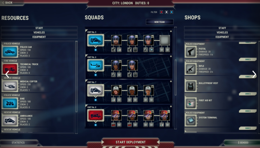 다수의 경찰관과 소방관과 구급대원을 당신의 마음대로 이용할 수 있습니다. 당신은 많은 차량들 (일반적인 구급차 부터 경찰 헬리콥터까지), 필수적인 장비들 (예시, 방탄조끼, 구급상자, 응급처치 키트와 도구상자등) 그리고 여러가지 능력을 가진 사람들로 구성된 팀을 사용할 수 있습니다.