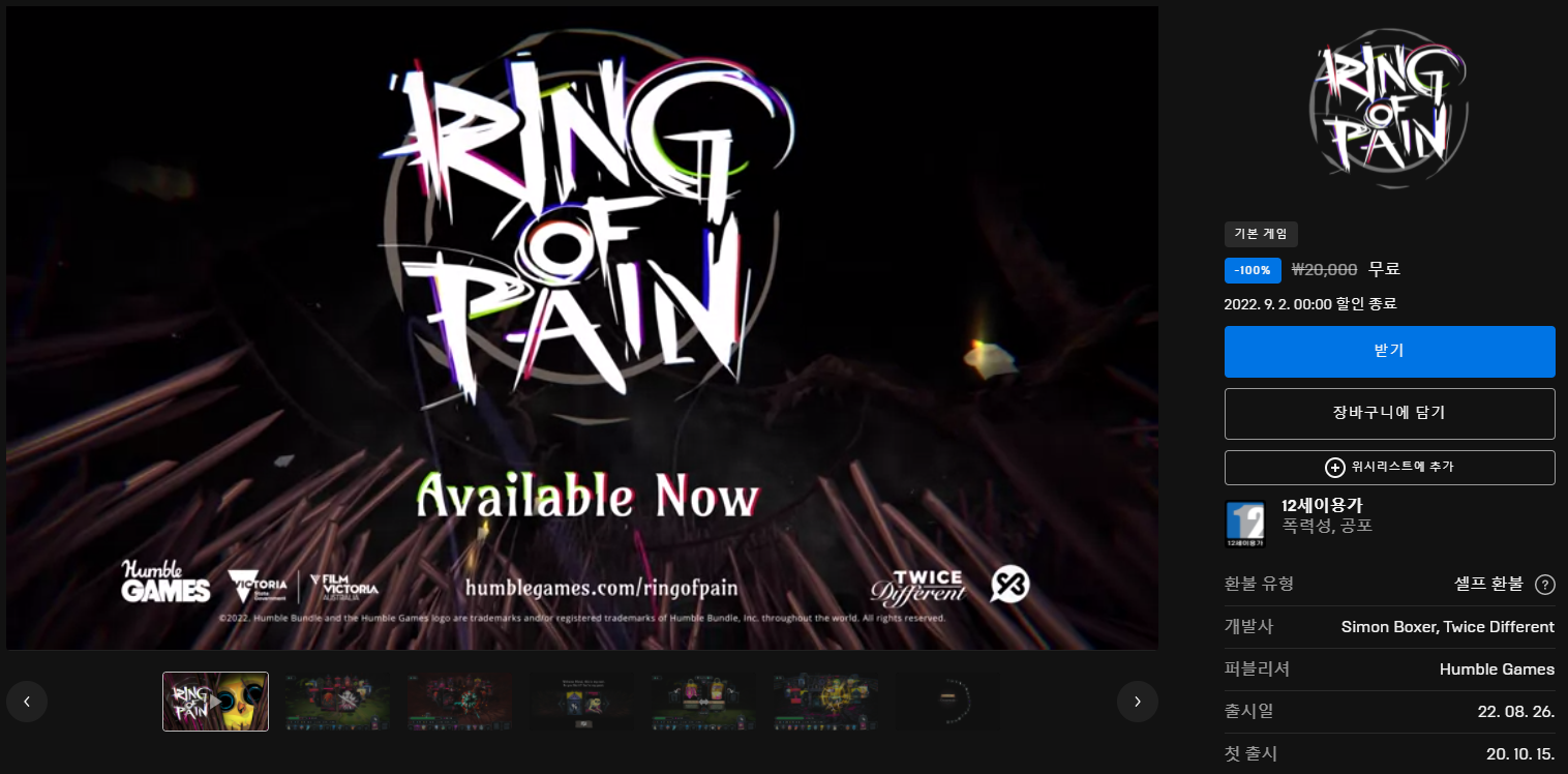 2022년 8월 마지막 주말, 에펙게임즈 무료 배포 게임은 "Ring of Pain" 입니다.