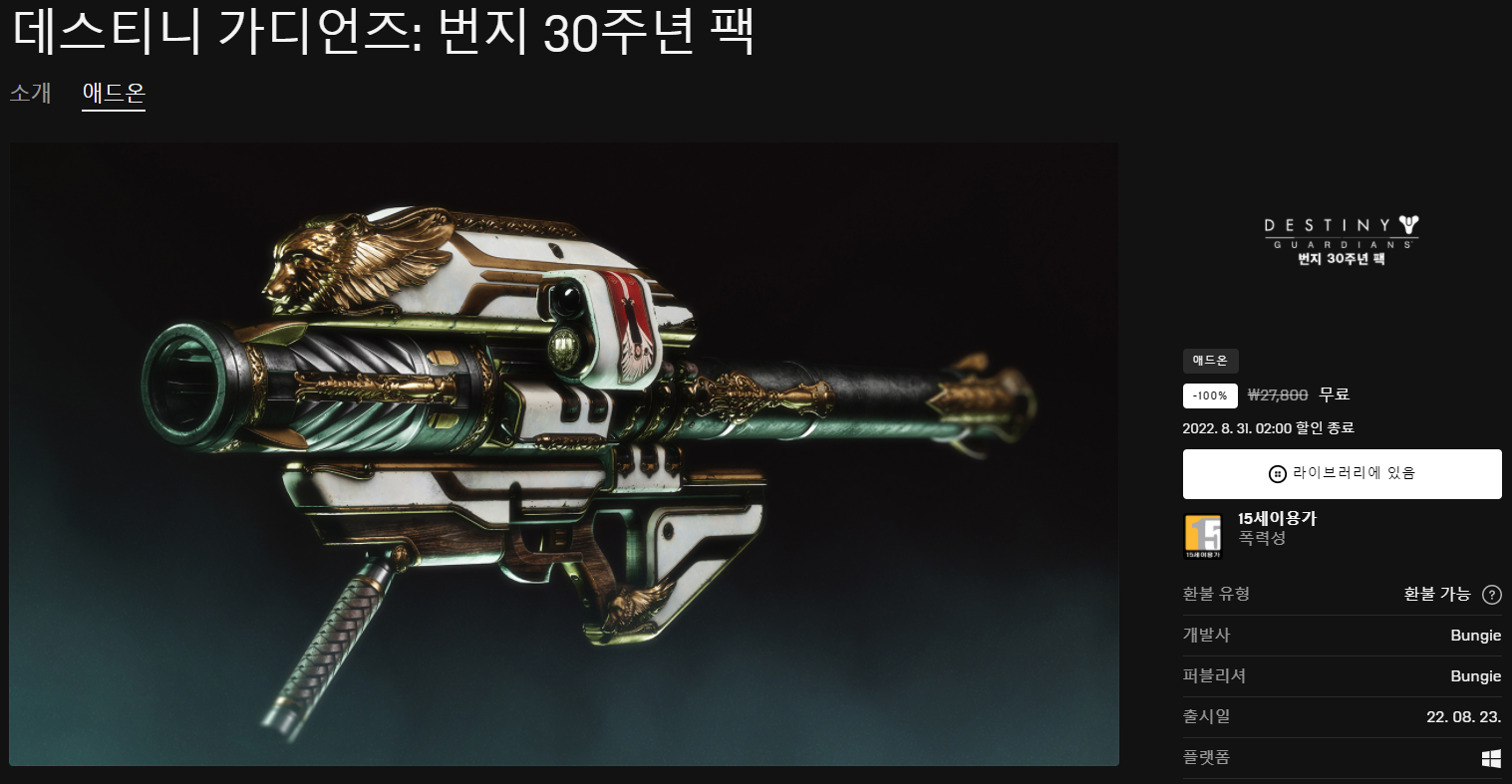 에픽게임즈에서 무료로 제공하는 번지 30주년 팩은 할인 기간과 달리 8월 31일 02시까지만 받을 수 있습니다.
