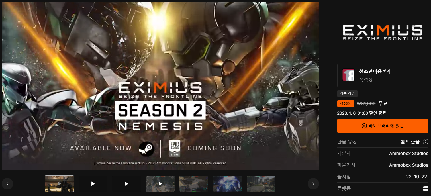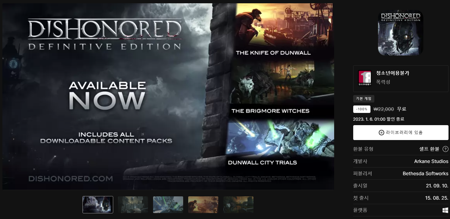 마지막 무료 배포는 "Dishonored:difinitive edition"과 "Eximius : seize the frontline" 입니다.